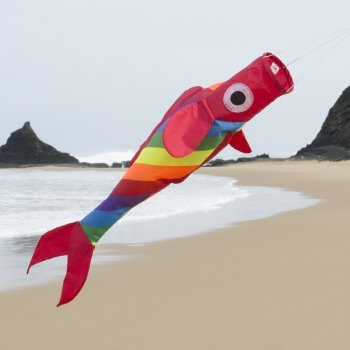Der Windsack ist einem großen Karpfen nachempfunden - Kopf und Schwanzflosse sind in Rot und der Körper in Regenbogenfarben gehalten